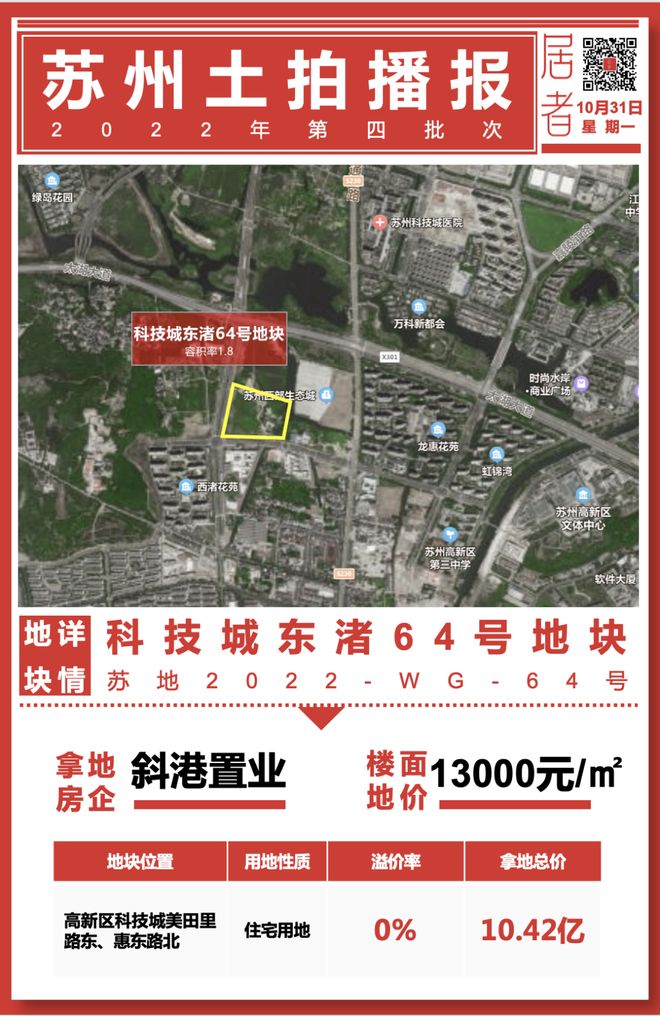 「美田锦华澜轩」即科技城64号地块,位于高新区科技城美田里路东、惠东路北,由苏州市斜港置业以底价104222万元拿下,成交楼面价13000元/㎡。