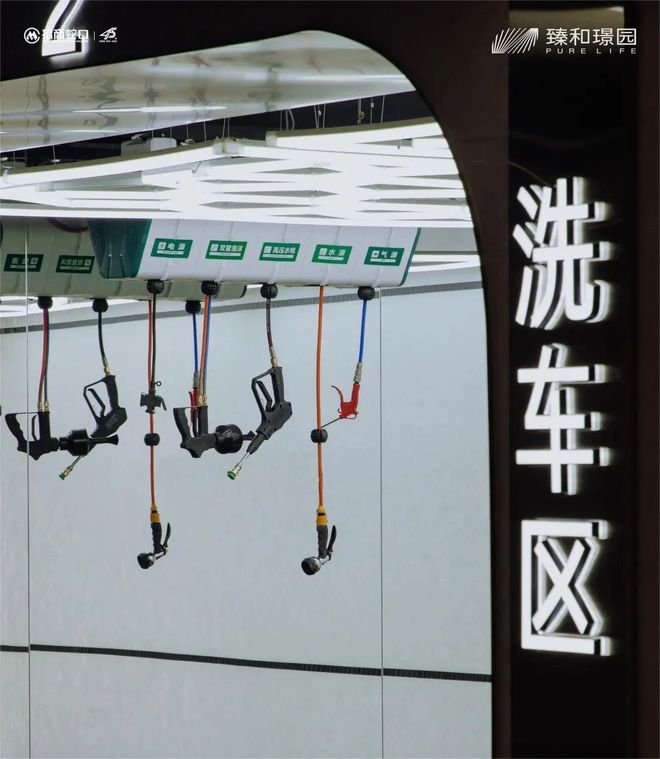 先看地库,车库落客区吊顶运用蜂窝铝板搭配射灯造型,墙面米色大板搭配石材抽槽造型,整体采用小橘皮环氧地坪,环保且降噪,墙面AI智能识别系统实现无感通行,安全便捷。地库还配备付费式自助洗车区,未来足不出户就能在家洗车。